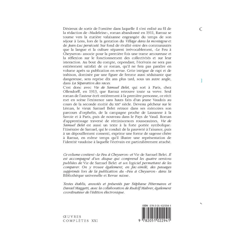 Ce volume contient " Le Feu à Cheyseron" et Vie de Samuel Belet. Il est accompagné d`un disque qui comprend les quatre versions publiées de Vie de Samuel Belet et un logiciel permettant de les comparer. On y trouve également, en fac-similé, des passages supprimés lors de la publication du "Feu à Cheyseron " dans la Bibliothèque universelle et Revue suisse.