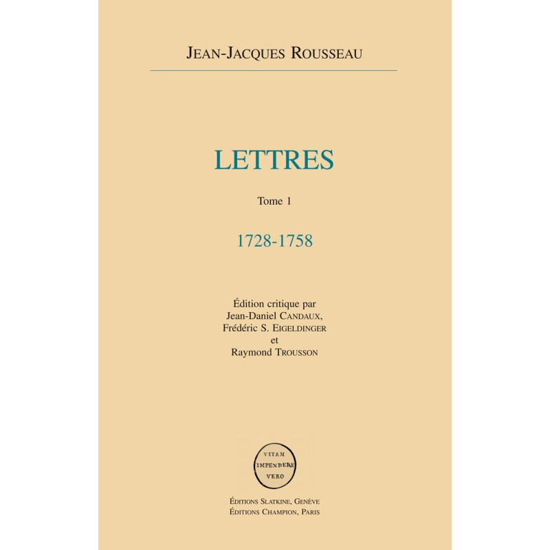Depuis 1998, date de la parution du dernier volume de la magistrale Correspondance complète de Jean-Jacques Rousseau publiée par Ralph A. Leigh, deux décennies se sont écoulées, au cours desquelles la recherche rousseauiste n’a cessé de proliférer. Le tricentenaire de la naissance de Jean- Jacques est l’occasion de proposer une nouvelle version, plus abordable, sous une forme modernisée et actualisée, qui, en sept volumes, offrira la totalité des lettres de Rousseau lui-même. L’entreprise se donne pour objectifs de publier des lettres inédites ou inconnues, d’éditer les textes revus, pour la plupart, sur les originaux, d’identifier certains correspondants, de rectifier certaines dates, de mettre à jour l’annotation en tenant compte des travaux les plus récents, tout en ne retenant que la correspondance privée soit 2412 lettres, et non les lettres destinées à la publication dans un périodique, et en ne tenant compte ni des « lettres fantômes » ni des lettres apocryphes. Le tome VII comporte un index cumulatif des noms propres et des noms de lieux ainsi qu’un dictionnaire des principaux correspondants. L’équipe éditoriale est composée de Jean-Daniel Candaux (Bibliothèque de Genève), Frédéric S. Eigeldinger (ancien professeur à l’Université de Neuchâtel) et Raymond Trousson (professeur émérite de l’Université libre de Bruxelles). Les 7 volumes de Lettres, comprenant un index général des noms et des œuvres, des notices sur les principaux correspondants et personnages-clés du XVIIIe siècle de l’entourage de Rousseau, la liste complète des références, peuvent être acquis séparément des Œuvres.