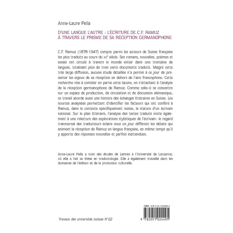 C.F. Ramuz (1878-1947) compte parmi les auteurs de Suisse française les plus traduits au cours du XXe siècle. Ses romans, nouvelles, poèmes et essais ont circulé à travers le monde entier dans une trentaine de langues, totalisant plus de trois cents documents traduits. Malgré cette très large diffusion, aucune étude détaillée n’a permis à ce jour de présenter les enjeux de sa réception en dehors de l’aire francophone. Cette recherche vise à combler en partie cette lacune, en s’attachant à l’analyse de la réception germanophone de Ramuz. Comme celle-ci se concentre sur un espace de production, de circulation et de discussion alémanique, ce travail aborde aussi une histoire des échanges littéraires en Suisse. Les sources analysées permettent d’identifier les facteurs qui ont conféré à Ramuz, dans le contexte spécifiquement suisse, la stature d’un écrivain national. Sur le plan littéraire, l’analyse des textes traduits invite également à une relecture des explorations stylistiques de l’écrivain : le regard transversal des traducteurs éclaire sous un jour différent les débats qui animent la réception de Ramuz en langue française, en même temps qu’il y apporte des réponses nouvelles et parfois inattendues. Anne-Laure Pella a suivi des études de Lettres à l’Université de Lausanne, où elle a fait sa thèse en traductologie. Elle a également travaillé dans les domaines de l’édition et de la promotion culturelle.