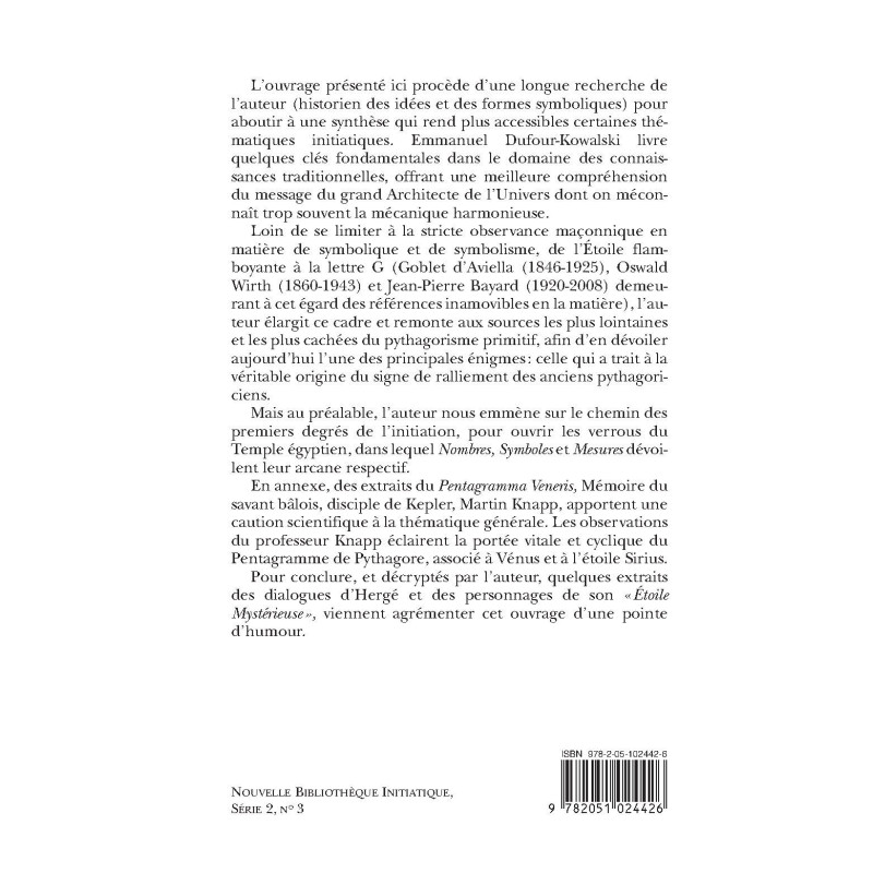 L’ouvrage présenté ici procède d’une longue recherche de l’auteur (historien des idées et des formes symboliques) pour aboutir à une synthèse qui rend plus accessibles certaines thématiques initiatiques. Emmanuel Dufour-Kowalski livre quelques clés fondamentales dans le domaine des connaissances traditionnelles, offrant une meilleure compréhension du message du grand Architecte de l’Univers dont on méconnaît trop souvent la mécanique harmonieuse. Loin de se limiter à la stricte observance maçonnique en matière de symbolique et de symbolisme, de l’Étoile flamboyante à la lettre G (Goblet d’Aviella (1846-1925), Oswald Wirth (1860-1943) et Jean-Pierre Bayard (1920-2008) demeurant à cet égard des références inamovibles en la matière), l’auteur élargit ce cadre et remonte aux sources les plus lointaines et les plus cachées du pythagorisme primitif, afin d’en dévoiler aujourd’hui l’une des principales énigmes : celle qui a trait à la véritable origine du signe de ralliement des anciens pythagoriciens. Mais au préalable, l’auteur nous emmène sur le chemin des premiers degrés de l’initiation, pour ouvrir les verrous du Temple égyptien, dans lequel Nombres, Symboles et Mesures dévoilent leur arcane respectif. En annexe, des extraits du Pentagramma Veneris, Mémoire du savant bâlois, disciple de Kepler, Martin Knapp, apportent une caution scientifique à la thématique générale. Les observations du professeur Knapp éclairent la portée vitale et cyclique du Pentagramme de Pythagore, associé à Vénus et à l’étoile Sirius. Pour conclure, et décryptés par l’auteur, quelques extraits des dialogues d’Hergé et des personnages de son «Étoile Mystérieuse », viennent agrémenter cet ouvrage d’une pointe d’humour.