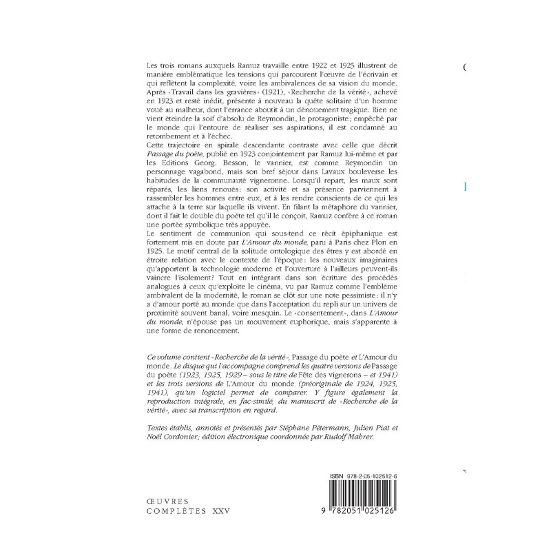 Les trois romans auxquels Ramuz travaille entre 1922 et 1925 illustrent de manière emblématique les tensions qui parcourent l’œuvre de l’écrivain et qui reflètent la complexité, voire les ambivalences de sa vision du monde. Après «Travail dans les gravières » (1921), « Recherche de la vérité », achevé en 1923 et resté inédit, présente à nouveau la quête solitaire d’un homme voué au malheur, dont l’errance aboutit à un dénouement tragique. Rien ne vient éteindre la soif d’absolu de Reymondin, le protagoniste ; empêché par le monde qui l’entoure de réaliser ses aspirations, il est condamné au retombement et à l’échec. Cette trajectoire en spirale descendante contraste avec celle que décrit Passage du poète, publié en 1923 conjointement par Ramuz lui-même et par les Editions Georg. Besson, le vannier, est comme Reymondin un personnage vagabond, mais son bref séjour dans Lavaux bouleverse les habitudes de la communauté vigneronne. Lorsqu’il repart, les maux sont réparés, les liens renoués : son activité et sa présence parviennent à rassembler les hommes entre eux, et à les rendre conscients de ce qui les attache à la terre sur laquelle ils vivent. En filant la métaphore du vannier, dont il fait le double du poète tel qu’il le conçoit, Ramuz confère à ce roman une portée symbolique très appuyée. Le sentiment de communion qui sous-tend ce récit épiphanique est fortement mis en doute par L’Amour du monde, paru à Paris chez Plon en 1925. Le motif central de la solitude ontologique des êtres y est abordé en étroite relation avec le contexte de l’époque : les nouveaux imaginaires qu’apportent la technologie moderne et l’ouverture à l’ailleurs peuvent-ils vaincre l’isolement ? Tout en intégrant dans son écriture des procédés analogues à ceux qu’exploite le cinéma, vu par Ramuz comme l’emblème ambivalent de la modernité, le roman se clôt sur une note pessimiste : il n’y a d’amour porté au monde que dans l’acceptation du repli sur un univers de proximité souvennt banal, voire mesquin.