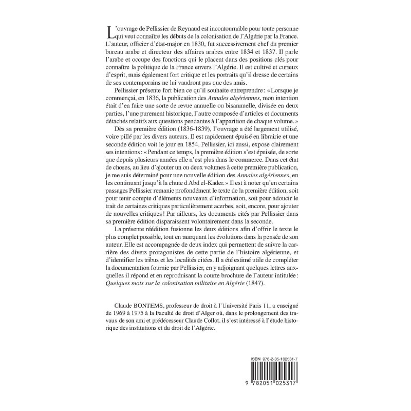 L’ouvrage de Pellissier de Reynaud est incontournable pour toute personne qui veut connaître les débuts de la colonisation de l’Algérie par la France. L’auteur, officier d’état-major en 1830, fut successivement chef du premier bureau arabe et directeur des affaires arabes entre 1834 et 1837. Il parle l’arabe et occupe des fonctions qui le placent dans des positions clés pour connaître la politique de la France envers l’Algérie. Il est cultivé et curieux d’esprit, mais également fort critique et les portraits qu’il dresse de certains de ses contemporains ne lui vaudront pas que des amis. Dès sa première édition (1836-1839), l’ouvrage a été largement utilisé, voire pillé par les divers auteurs. Il est rapidement épuisé en librairie et une seconde édition voit le jour en 1854. Il est à noter qu’en certains passages Pellissier remanie profondément le texte de la première édition, soit pour tenir compte d’éléments nouveaux d’information, soit pour adoucir le trait de certaines critiques particulièrement acerbes, soit, encore, pour ajouter de nouvelles critiques ! Par ailleurs, les documents cités par Pellissier dans sa première édition disparaissent volontairement dans la seconde. La présente réédition fusionne les deux éditions afin d’offrir le texte le plus complet possible, tout en marquant les évolutions dans la pensée de son auteur. Elle est accompagnée de deux index qui permettent de suivre la carrière des divers protagonistes de cette partie de l’histoire algérienne, et d’identifier les tribus et les localités citées. Il a été estimé utile de compléter la documentation fournie par Pellissier, en y adjoignant quelques lettres auxquelles il répond et en reproduisant la courte brochure de l’auteur intitulée : « Quelques mots sur la colonisation militaire en Algérie » (1847).