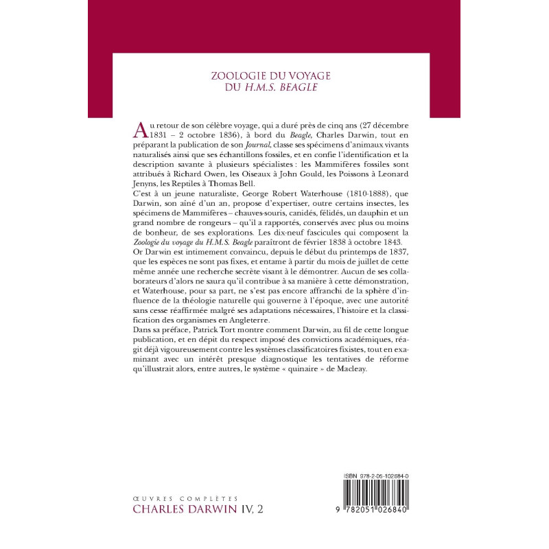 C’est à un jeune naturaliste, George Robert Waterhouse (1810-1888), que Darwin, son aîné d’un an, propose d’expertiser, outre certains insectes, les spécimens de Mammifères – chauves-souris, canidés, félidés, un dauphin et un grand nombre de rongeurs – qu’il a rapportés, conservés avec plus ou moins de bonheur, de ses explorations. Les dix-neuf fascicules qui composent la Zoologie du voyage du H.M.S. Beagle paraîtront de février 1838 à octobre 1843.