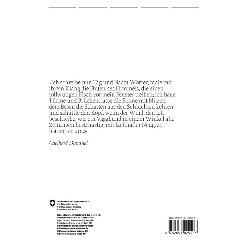Éditorial • Beatrice von Matt Das «Holly» und die Dichtkunst. Adelheid Duvanels Pœtik • Peter von Matt Duvanels Erzählspiele • Caspar Battegay Am falschen Ort. Adelheid Duvanels radikale Heimatliteratur • Christine Weder In aller Öffentlichkeit versteckt. Adelheid Duvanel als Kolumnistin • Valerie Meyer «Ich kenne nicht sehr viele Worte» – Adelheid Duvanels Erzählen in den 1960er Jahren • Adelheid Duvanel Käthy und Peter (illustrierte Kindergeschichte) • Monika Jagfeld Adelheid Duvanel, Malerin mit Worten und Farben • Joanna Nowotny Kippmomente. Adelheid Duvanels Ästhetik am Abgrund in Text und Bild • Silvia Henke Lust und Schrecken: Ein längerer Blick auf einige Zeichnungen von Adelheid Duvanel • Angelica Baum «Ich schreibe in einer ganz grossen Einsamkeit». Zu den Briefen von Adelheid Duvanel • Catherine Fagnot « Il entendait leurs pas, les entendait parler, mais ne comprenait rien » • Friederike Kretzen Sprengsätze • Michael Fehr ELISA •Autorinnen und Autoren • Impressum