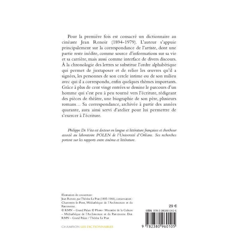 Pour la première fois est consacré un dictionnaire au cinéaste Jean Renoir (1894-1979). L’auteur s’appuie principalement sur la correspondance de l’artiste, dont une partie reste inédite, comme source d’informations sur sa vie et sa carrière, mais aussi comme interface de divers discours. À la chronologie des lettres se substitue l’ordre alphabétique qui permet de juxtaposer et de relier les œuvres qu’il a signées, les personnes de son cercle intime ou de son milieu avec qui il a correspondu, enfin quelques thèmes importants. Grâce à plus de cent vingt entrées se dessine le parcours d’un homme qui s’est peu à peu tourné vers l’écriture, rédigeant des pièces de théâtre, une biographie de son père, plusieurs romans… Sa correspondance, archivée à partir des années quarante, aura ainsi servi d’atelier pour lui permettre de s’exercer à l’écriture.