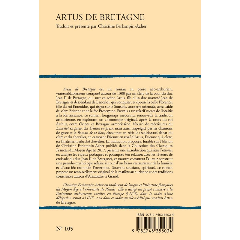 Christine Ferlampin-Acher est professeur de langue et littérature françaises du Moyen Âge à l’université de Rennes. Elle a dirigé un projet consacré à la littérature arthurienne tardive en Europe (LATE) dans le cadre d’une délégation senior à l’IUF : c’est dans ce cadre qu’elle a édité puis traduit Artus de Bretagne.