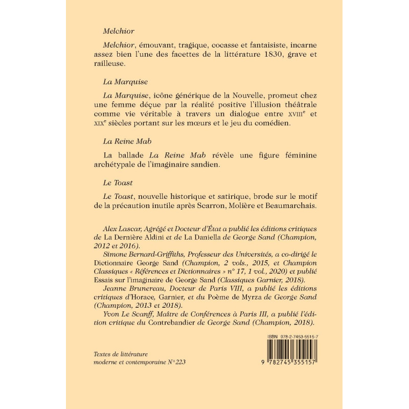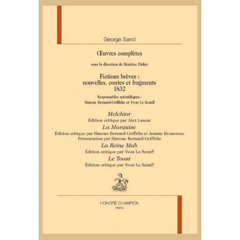 Simone Bernard-Griffiths, Professeur des Universités, a co-dirigé le Dictionnaire George Sand (Champion, 2 vols., 2015, et Champion Classiques « Références et Dictionnaires » n° 17, 1 vol., 2020) et publié Essais sur l’imaginaire de George Sand (Classiques Garnier, 2018).