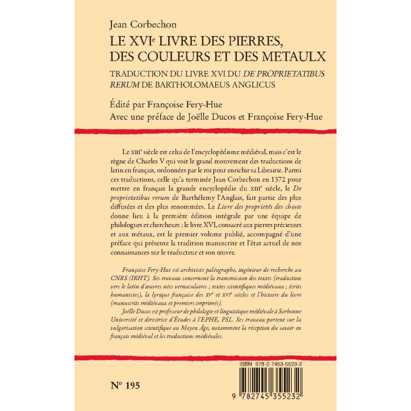 Le XIIIe siècle est celui de l’encyclopédisme médiéval, mais c’est le règne de Charles V qui voit le grand mouvement des traductions de latin en français, ordonnées par le roi pour enrichir sa Librairie. Parmi ces traductions, celle qu’a terminée Jean Corbechon en 1372 pour mettre en français la grande encyclopédie du XIIIe siècle, le De proprietatibus rerum de Barthélemy l’Anglais, fait partie des plus diffusées et des plus renommées. Le Livre des proprietés des choses donne lieu à la première édition intégrale par une équipe de philologues et chercheurs ; le livre XVI, consacré aux pierres précieuses et aux métaux, est le premier volume publié, accompagné d’une préface qui présente la tradition manuscrite et l’état actuel de nos connaissances sur le traducteur et son œuvre.