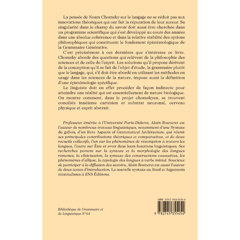 La pensée de Noam Chomsky sur le langage ne se réduit pas aux innovations théoriques qui ont fait la réputation de leur auteur. Sa singularité dans le champ du savoir doit aussi être cherchée dans un programme scientifique qui s’est développé au cours des années dans une absolue cohérence et dans la relative stabilité des options philosophiques qui constituent le fondement épistémologique de la Grammaire Générative.