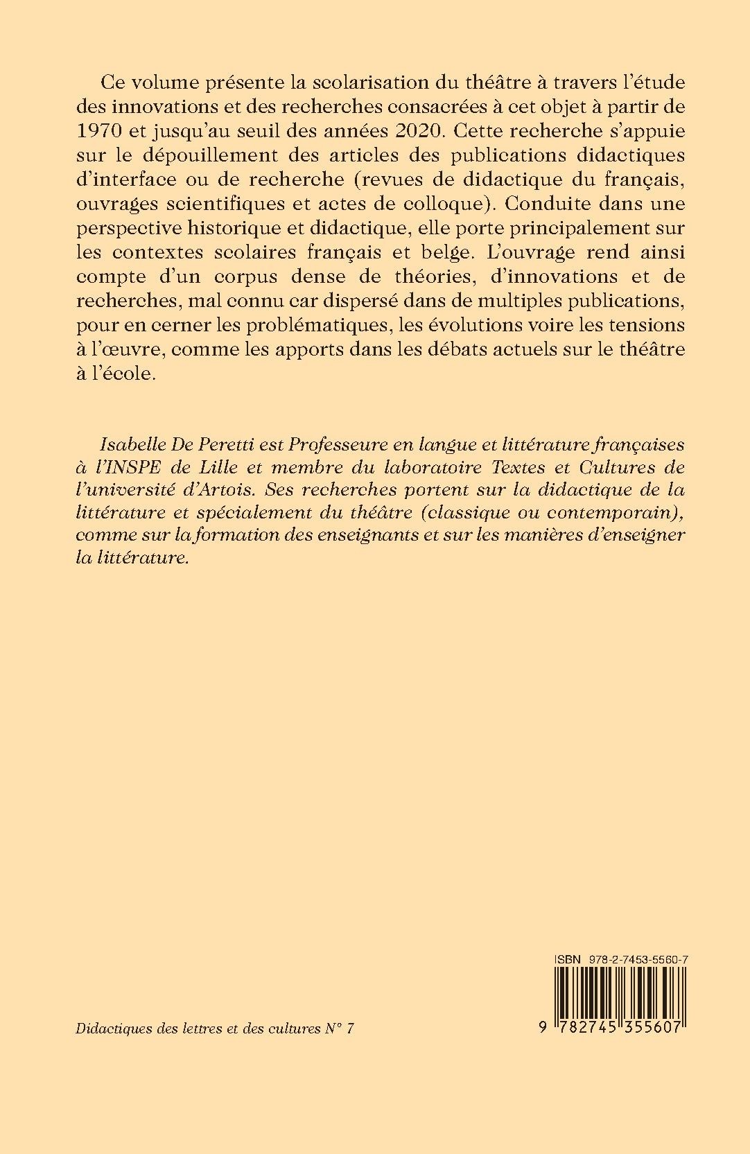 Ce volume présente la scolarisation du théâtre à travers l’étude des innovations et des recherches consacrées à cet objet à partir de 1970 et jusqu’au seuil des années 2020. Cette recherche s’appuie sur le dépouillement des articles des publications didactiques d’interface ou de recherche (revues de didactique du français, ouvrages scientifiques et actes de colloque). Conduite dans une perspective historique et didactique, elle porte principalement sur les contextes scolaires français et belge. L’ouvrage rend ainsi compte d’un corpus dense de théories, d’innovations et de recherches, mal connu car dispersé dans de multiples publications, pour en cerner les problématiques, les évolutions voire les tensions à l’œuvre, comme les apports dans les débats actuels sur le théâtre à l’école.