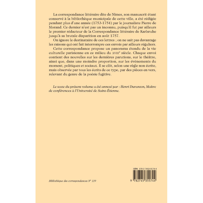La correspondance littéraire dite de Nîmes, son manuscrit étant conservé à la bibliothèque municipale de cette ville, a été rédigée pendant plus d’une année (1753-1754) par le journaliste Pierre de Morand. Ce dernier n’est pas un inconnu, puisqu’il fut par ailleurs le premier rédacteur de la Correspondance littéraire de Karlsruhe jusqu’à sa brutale disparition en août 1757.