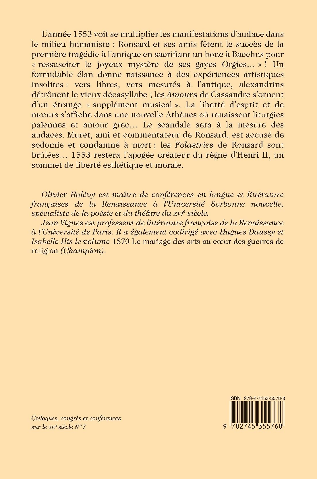 L’année 1553 voit se multiplier les manifestations d’audace dans le milieu humaniste : Ronsard et ses amis fêtent le succès de la première tragédie à l’antique en sacrifiant un bouc à Bacchus pour « ressusciter le joyeux mystère de ses gayes Orgies… » ! Un formidable élan donne naissance à des expériences artistiques insolites : vers libres, vers mesurés à l’antique, alexandrins détrônent le vieux décasyllabe ; les Amours de Cassandre s’ornent d’un étrange « supplément musical ». La liberté d’esprit et de mœurs s’affiche dans une nouvelle Athènes où renaissent liturgies païennes et amour grec… Le scandale sera à la mesure des audaces. Muret, ami et commentateur de Ronsard, est accusé de sodomie et condamné à mort ; les Folastries de Ronsard sont brûlées… 1553 restera l’apogée créateur du règne d’Henri II, un sommet de liberté esthétique et morale.