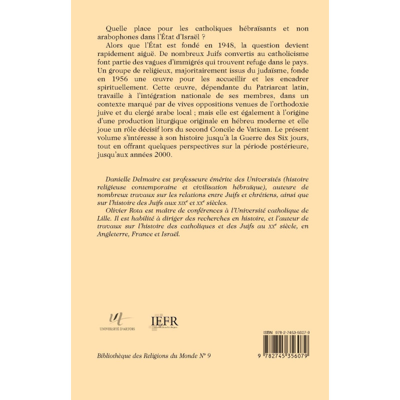 Alors que l’État est fondé en 1948, la question devient rapidement aiguë. De nombreux Juifs convertis au catholicisme font partie des vagues d’immigrés qui trouvent refuge dans le pays. Un groupe de religieux, majoritairement issus du judaïsme, fonde en 1956 une oeuvre pour les accueillir et les encadrer spirituellement. Cette oeuvre, dépendante du Patriarcat latin, travaille à l’intégration nationale de ses membres, dans un contexte marqué par de vives oppositions venues de l’orthodoxie juive et du clergé arabe local ; mais elle est également à l’origine d’une production liturgique originale en hébreu moderne et elle joue un rôle décisif lors du second Concile de Vatican. Le présent volume s’intéresse à son histoire jusqu’à la Guerre des Six jours, tout en offrant quelques perspectives sur la période postérieure, jusqu’aux années 2000.