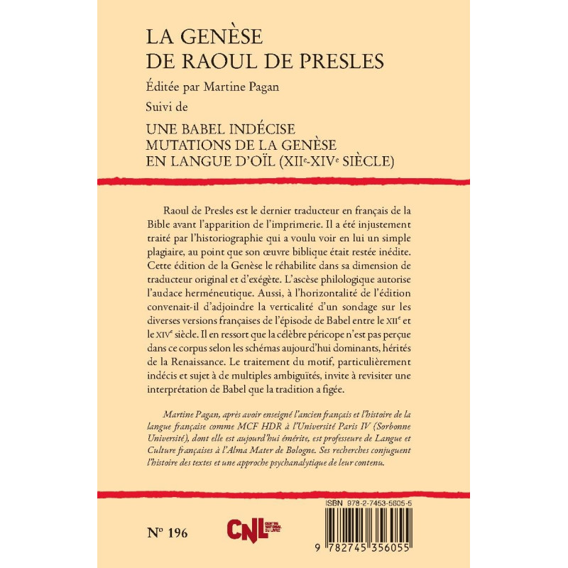 Raoul de Presles est le dernier traducteur en français de la Bible avant l’apparition de l’imprimerie. Il a été injustement traité par l’historiographie qui a voulu voir en lui un simple plagiaire, au point que son oeuvre biblique était restée inédite. Cette édition de la Genèse le réhabilite dans sa dimension de traducteur original et d’exégète. L’ascèse philologique autorise l’audace herméneutique. Aussi, à l’horizontalité de l’édition convenait-il d’adjoindre la verticalité d’un sondage sur les diverses versions françaises de l’épisode de Babel entre le XIIe et le XIVe siècle. Il en ressort que la célèbre péricope n’est pas perçue dans ce corpus selon les schémas aujourd’hui dominants, hérités de la Renaissance. Le traitement du motif, particulièrement indécis et sujet à de multiples ambiguïtés, invite à revisiter une interprétation de Babel que la tradition a figée.