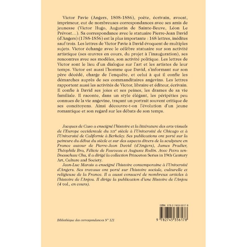Victor Pavie (Angers, 1808-1886), poète, écrivain, avocat, imprimeur, eut de nombreuses correspondances avec ses amis de jeunesse (Victor Hugo, Augustin de Sainte-Beuve, Léon Le Prévost…). Sa correspondance avec le statuaire Pierre-Jean David (d’Angers) (1788-1856) est la plus importante : 168 lettres, inédites sauf trois. Les lettres de Victor Pavie à David évoquent de multiples sujets. Victor échange avec le célèbre statuaire sur son activité artistique (ses œuvres en cours, du projet à l’inauguration), ses rencontres avec ses modèles, son activité politique. Les lettres de Victor sont le lieu d’un dialogue sur l’art et les artistes de leur temps. Victor est aussi l’homme que David, s’informant sur son père décédé, charge de l’enquête, et celui à qui il confie les démarches auprès de ses commanditaires angevins. Les lettres rapportent aussi les activités de Victor, libraire et éditeur, écrivain. Il confie à David ses joies et ses peines, les drames de sa vie familiale. Il raconte, dans un style élégant, les péripéties peu connues de la vie angevine, traçant un portrait souvent critique de ses concitoyens. Ainsi découvre-t-on l’évolution d’un jeune romantique et son regard sur les débats de son temps.