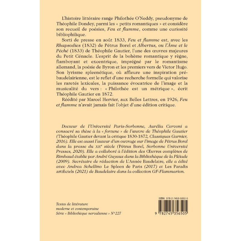 Sorti de presse en août 1833, Feu et flamme est, avec les Rhapsodies (1832) de Pétrus Borel et Albertus, ou l’Âme et le Péché (1833) de Théophile Gautier, l’une des œuvres majeures du Petit Cénacle. L’esprit de la bohème romantique y règne, flamboyant et excentrique, imprégné par le romantisme allemand, la poésie de Byron et les premiers vers de Victor Hugo. Son lyrisme spleenétique, où affleure une inspiration pré-baudelairienne, est le reflet d’une recherche formelle qui valorise les raretés lexicales, la puissance évocatrice de l’image et la musicalité du vers : « Philothée est un métrique », écrit Théophile Gautier en 1872.