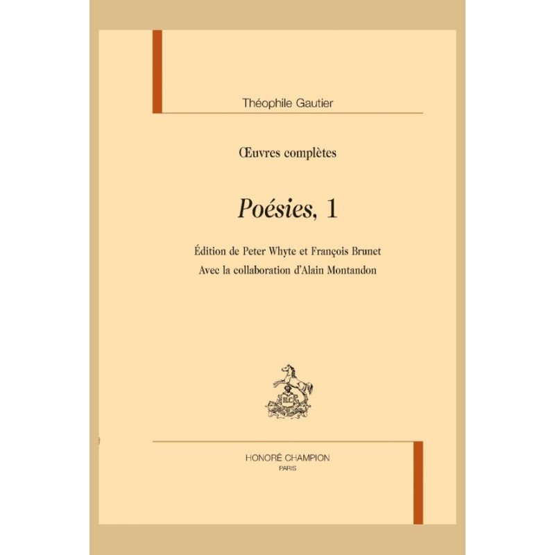 Ce premier tome des poésies de Gautier contient les pièces réunies en volume jusqu’en 1845, date où furent publiées les Poésies complètes, édition en quatre parties, soit : Albertus, La Comédie de la mort, Poésies diverses, Poésies nouvelles. Paru en 1832, Albertus, outre le poème narratif homonyme, reproduisait les quarante-deux pièces du premier recueil (Poésies, 1830) et vingt autres poésies de la période 1830-1832. La Comédie de la mort (1838) contient non seulement le long poème qui porte ce titre, mais encore cinquante-sept textes qui se retrouveront sous le titre Poésies diverses dans les Poésies complètes (1845). Dans ce dernier recueil, sous la rubrique Poésies nouvelles, se trouvent les ‘Pièces diverses’, seize poèmes qui datent de 1839-1845, ainsi que le recueil España, qui rassemble quarante-trois poésies publiées à la même époque. Dans la présente édition, on trouvera des Notices en tête des recueils, des détails bibliographiques pour chaque poème, des commentaires, des notes explicatives et de nombreuses variantes des manuscrits et des imprimés. Nous reproduisons en outre les six poésies publiées en 1830-32 qui furent écartées en 1845, ainsi que la Préface d’Albertus (1832), non réimprimée du vivant de l’auteur.