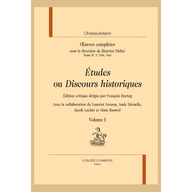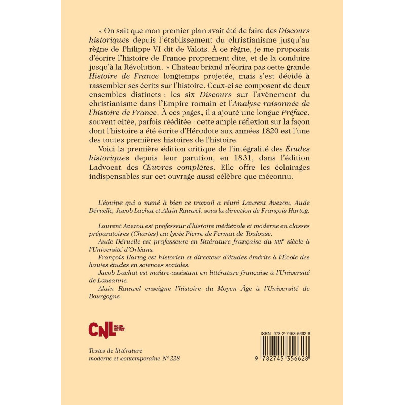 « On sait que mon premier plan avait été de faire des Discours historiques depuis l’établissement du christianisme jusqu’au règne de Philippe VI dit de Valois. À ce règne, je me proposais d’écrire l’histoire de France proprement dite, et de la conduire jusqu’à la Révolution. » Chateaubriand n’écrira pas cette grande Histoire de France longtemps projetée, mais s’est décidé à rassembler ses écrits sur l’histoire. Ceux-ci se composent de deux ensembles distincts : les six Discours sur l’avènement du christianisme dans l’Empire romain et l’Analyse raisonnée de l’histoire de France. À ces pages, il a ajouté une longue Préface, souvent citée, parfois rééditée : cette ample réflexion sur la façon dont l’histoire a été écrite d’Hérodote aux années 1820 est l’une des toutes premières histoires de l’histoire.