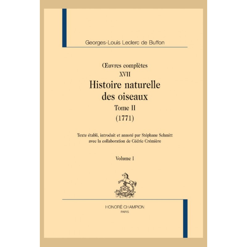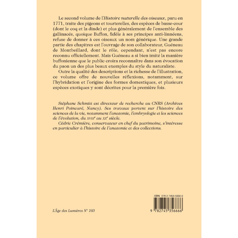 Le second volume de l’Histoire naturelle des oiseaux, paru en 1771, traite des pigeons et tourterelles, des espèces de basse-cour (dont le coq et la dinde) et plus généralement de l’ensemble des gallinacés, quoique Buffon, fidèle à ses principes anti-linnéens, refuse de donner à ces oiseaux un nom générique. Une grande partie des chapitres est l’ouvrage de son collaborateur, Guéneau de Montbeillard, dont le rôle, cependant, n’est pas encore reconnu officiellement. Mais Guéneau a si bien imité la manière buffonienne que le public croira reconnaître dans son évocation du paon un des plus beaux exemples du style du naturaliste.