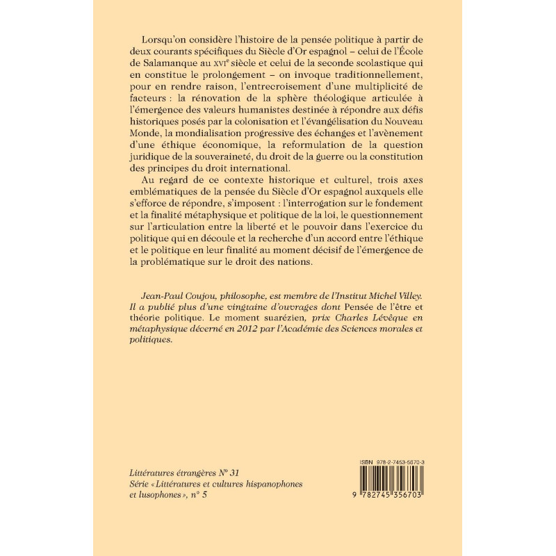 Lorsqu’on considère l’histoire de la pensée politique à partir de deux courants spécifiques du Siècle d’Or espagnol − celui de l’École de Salamanque au XVIe siècle et celui de la seconde scolastique qui en constitue le prolongement − on invoque traditionnellement, pour en rendre raison, l’entrecroisement d’une multiplicité de facteurs : la rénovation de la sphère théologique articulée à l’émergence des valeurs humanistes destinée à répondre aux défis historiques posés par la colonisation et l’évangélisation du Nouveau Monde, la mondialisation progressive des échanges et l’avènement d’une éthique économique, la reformulation de la question juridique de la souveraineté, du droit de la guerre ou la constitution des principes du droit international.