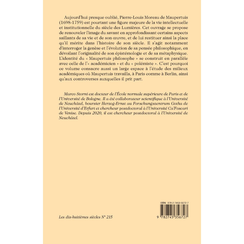 Aujourd’hui presque oublié, Pierre-Louis Moreau de Maupertuis (1698-1759) est pourtant une figure majeure de la vie intellectuelle et institutionnelle du siècle des Lumières. Cet ouvrage se propose de renouveler l’image du savant en approfondissant certains aspects saillants de sa vie et de son œuvre, et de lui restituer ainsi la place qu’il mérite dans l’histoire de son siècle. Il s’agit notamment d’interroger la genèse et l’évolution de sa pensée philosophique, en dévoilant l’originalité de son épistémologie et de sa métaphysique. L’identité du « Maupertuis philosophe » se construit en parallèle avec celle de l’« académicien » et du « polémiste ». C’est pourquoi ce volume consacre aussi un large espace à l’étude des milieux académiques où Maupertuis travailla, à Paris comme à Berlin, ainsi qu’aux controverses auxquelles il prit part.