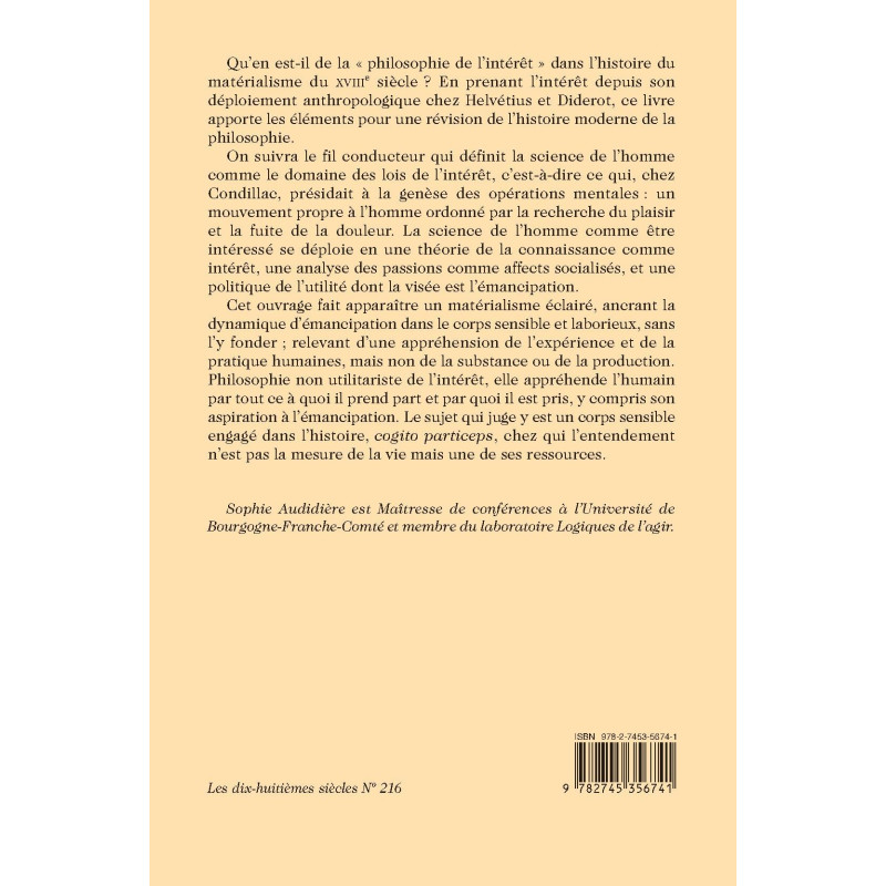 On suivra le fil conducteur qui définit la science de l’homme comme le domaine des lois de l’intérêt, c’est-à-dire ce qui, chez Condillac, présidait à la genèse des opérations mentales : un mouvement propre à l’homme ordonné par la recherche du plaisir et la fuite de la douleur. La science de l’homme comme être intéressé se déploie en une théorie de la connaissance comme intérêt, une analyse des passions comme affects socialisés, et une politique de l’utilité dont la visée est l’émancipation.