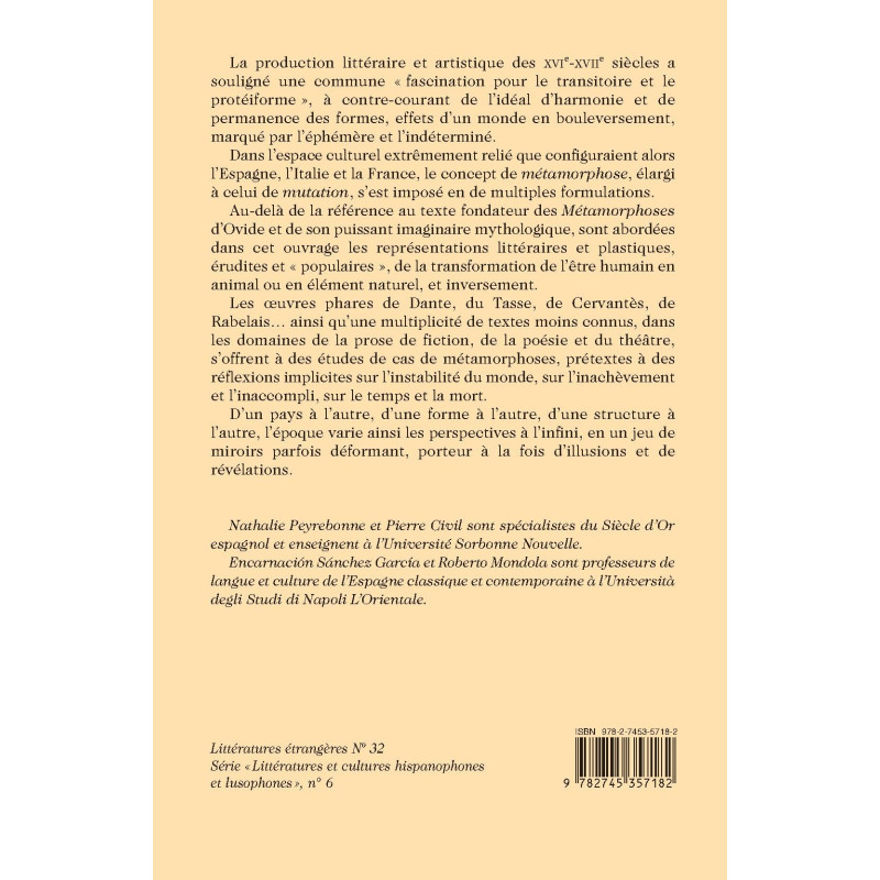 Les œuvres phares de Dante, du Tasse, de Cervantès, de Rabelais… ainsi qu’une multiplicité de textes moins connus, dans les domaines de la prose de fiction, de la poésie et du théâtre, s’offrent à des études de cas de métamorphoses, prétextes à des réflexions implicites sur l’instabilité du monde, sur l’inachèvement et l’inaccompli, sur le temps et la mort.