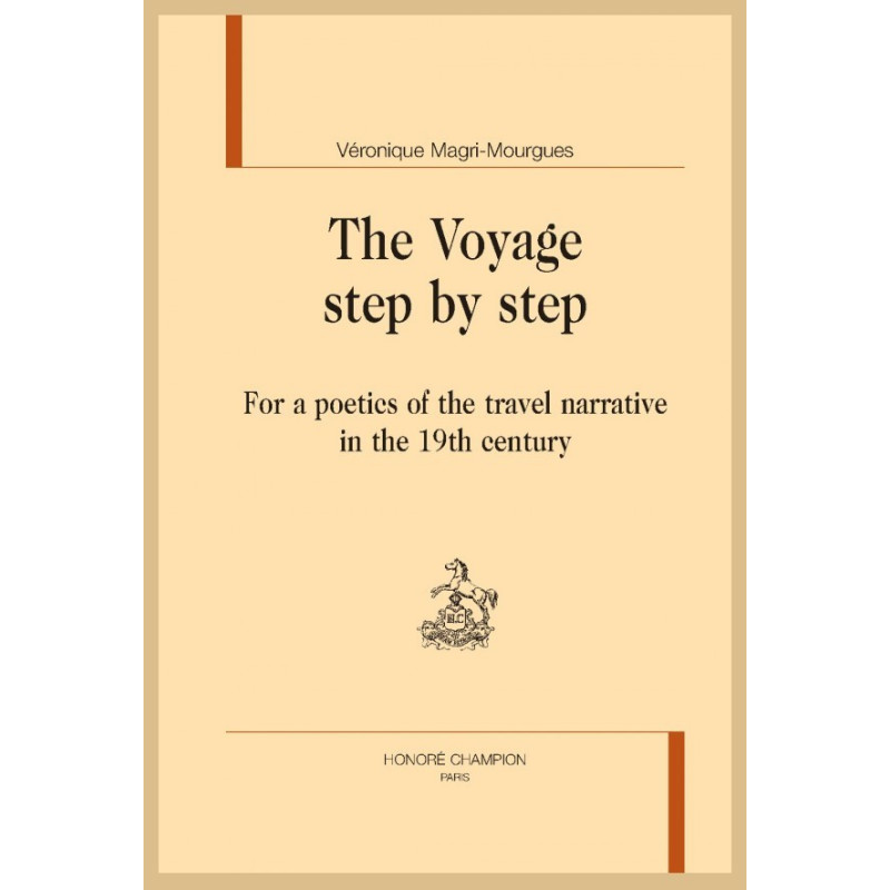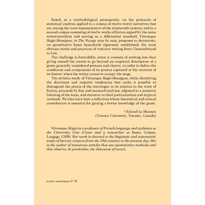 Based, as a methodological prerequisite, on the protocols of statistical analysis applied to a corpus of twelve travel narratives that are among the most representative of the nineteenth century, and to a second corpus consisting of twelve works of fiction signed by the same writer-travellers and serving as a differential standard, Véronique Magri-Mourgues, in The Voyage step by step, proposes to demarcate, on quantitative bases henceforth rigorously established, the most obvious marks and practices of viaticum writing from Chateaubriand to Loti.