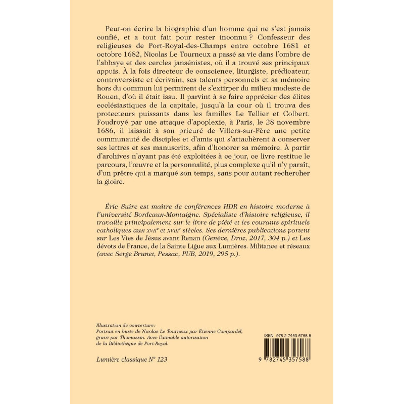 Peut-on écrire la biographie d’un homme qui ne s’est jamais confié, et a tout fait pour rester inconnu ? Confesseur des religieuses de Port-Royal-des-Champs entre octobre 1681 et octobre 1682, Nicolas Le Tourneux a passé sa vie dans l’ombre de l’abbaye et des cercles jansénistes, où il a trouvé ses principaux appuis. À la fois directeur de conscience, liturgiste, prédicateur, controversiste et écrivain, ses talents personnels et sa mémoire hors du commun lui permirent de s’extirper du milieu modeste de Rouen, d’où il était issu. Il parvint à se faire apprécier des élites ecclésiastiques de la capitale, jusqu’à la cour où il trouva des protecteurs puissants dans les familles Le Tellier et Colbert. Foudroyé par une attaque d’apoplexie, à Paris, le 28 novembre 1686, il laissait à son prieuré de Villers-sur-Fère une petite communauté de disciples et d’amis qui s’attachèrent à conserver ses lettres et ses manuscrits, afin d’honorer sa mémoire. À partir d’archives n’ayant pas été exploitées à ce jour, ce livre restitue le parcours, l’œuvre et la personnalité, plus complexe qu’il n’y paraît, d’un prêtre qui a marqué son temps, sans pour autant rechercher la gloire.
