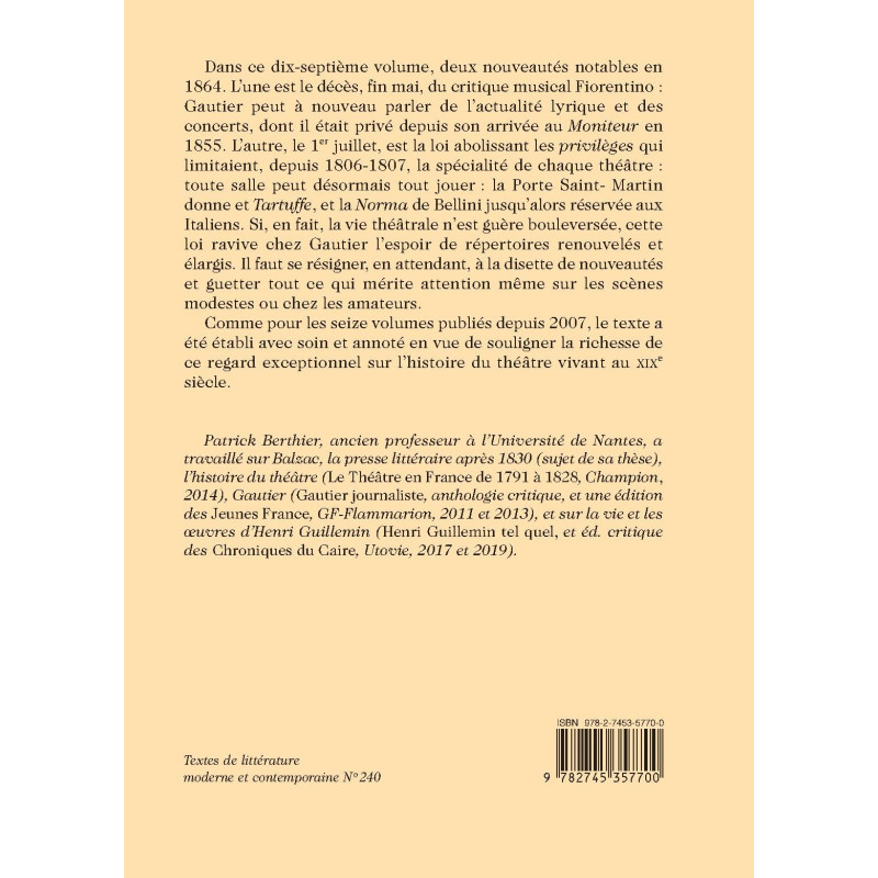 Dans ce dix-septième volume, deux nouveautés notables en 1864. L’une est le décès, fin mai, du critique musical Fiorentino : Gautier peut à nouveau parler de l’actualité lyrique et des concerts, dont il était privé depuis son arrivée au Moniteur en 1855. L’autre, le 1er juillet, est la loi abolissant les privilèges qui limitaient, depuis 1806-1807, la spécialité de chaque théâtre : toute salle peut désormais tout jouer : la Porte Saint- Martin donne et Tartuffe, et la Norma de Bellini jusqu’alors réservée aux Italiens. Si, en fait, la vie théâtrale n’est guère bouleversée, cette loi ravive chez Gautier l’espoir de répertoires renouvelés et élargis. Il faut se résigner, en attendant, à la disette de nouveautés et guetter tout ce qui mérite attention même sur les scènes modestes ou chez les amateurs.