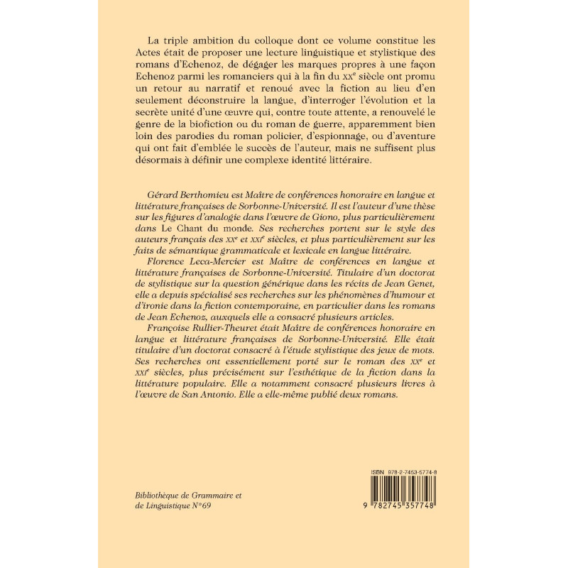 La triple ambition du colloque dont ce volume constitue les Actes était de proposer une lecture linguistique et stylistique des romans d’Echenoz, de dégager les marques propres à une façon Echenoz parmi les romanciers qui à la fin du XXe siècle ont promu un retour au narratif et renoué avec la fiction au lieu d’en seulement déconstruire la langue, d’interroger l’évolution et la secrète unité d’une œuvre qui, contre toute attente, a renouvelé le genre de la biofiction ou du roman de guerre, apparemment bien loin des parodies du roman policier, d’espionnage, ou d’aventure qui ont fait d’emblée le succès de l’auteur, mais ne suffisent plus désormais à définir une complexe identité littéraire.
