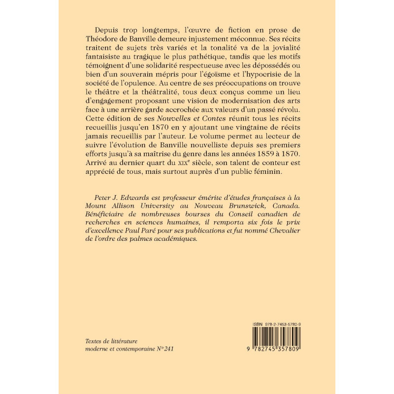Depuis trop longtemps, l’œuvre de fiction en prose de Théodore de Banville demeure injustement méconnue. Ses récits traitent de sujets très variés et la tonalité va de la jovialité fantaisiste au tragique le plus pathétique, tandis que les motifs témoignent d’une solidarité respectueuse avec les dépossédés ou bien d’un souverain mépris pour l’égoïsme et l’hypocrisie de la société de l’opulence. Au centre de ses préoccupations on trouve le théâtre et la théâtralité, tous deux conçus comme un lieu d’engagement proposant une vision de modernisation des arts face à une arrière garde accrochée aux valeurs d’un passé révolu. Cette édition de ses Nouvelles et Contes réunit tous les récits recueillis jusqu’en 1870 en y ajoutant une vingtaine de récits jamais recueillis par l’auteur. Le volume permet au lecteur de suivre l’évolution de Banville nouvelliste depuis ses premiers efforts jusqu’à sa maîtrise du genre dans les années 1859 à 1870. Arrivé au dernier quart du XIXe siècle, son talent de conteur est apprécié de tous, mais surtout auprès d’un public féminin.