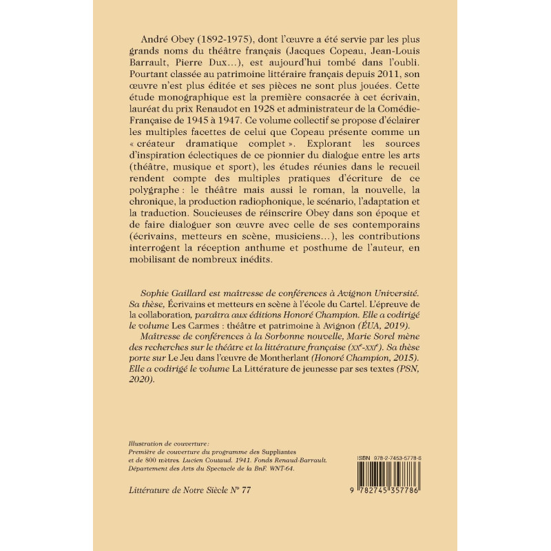 André Obey (1892-1975), dont l’œuvre a été servie par les plus grands noms du théâtre français (Jacques Copeau, Jean-Louis Barrault, Pierre Dux…), est aujourd’hui tombé dans l’oubli. Pourtant classée au patrimoine littéraire français depuis 2011, son œuvre n’est plus éditée et ses pièces ne sont plus jouées. Cette étude monographique est la première consacrée à cet écrivain, lauréat du prix Renaudot en 1928 et administrateur de la Comédie- Française de 1945 à 1947. Ce volume collectif se propose d’éclairer les multiples facettes de celui que Copeau présente comme un « créateur dramatique complet ». Explorant les sources d’inspiration éclectiques de ce pionnier du dialogue entre les arts (théâtre, musique et sport), les études réunies dans le recueil rendent compte des multiples pratiques d’écriture de ce polygraphe : le théâtre mais aussi le roman, la nouvelle, la chronique, la production radiophonique, le scénario, l’adaptation et la traduction. Soucieuses de réinscrire Obey dans son époque et de faire dialoguer son œuvre avec celle de ses contemporains (écrivains, metteurs en scène, musiciens…), les contributions interrogent la réception anthume et posthume de l’auteur, en mobilisant de nombreux inédits.