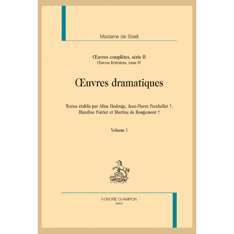 Germaine de Staël dramaturge ? De cette figure majeure du tournant des Lumières sont souvent retenus les romans et les essais politiques. Seulement deux pièces furent publiées de son vivant à une douzaine d’exemplaires. Il fallut attendre la parution posthume, en 1820-1821, des Œuvres complètes chez Truttel et Würtz, pour que se dévoile cette nouvelle facette de l’écriture staëlienne.