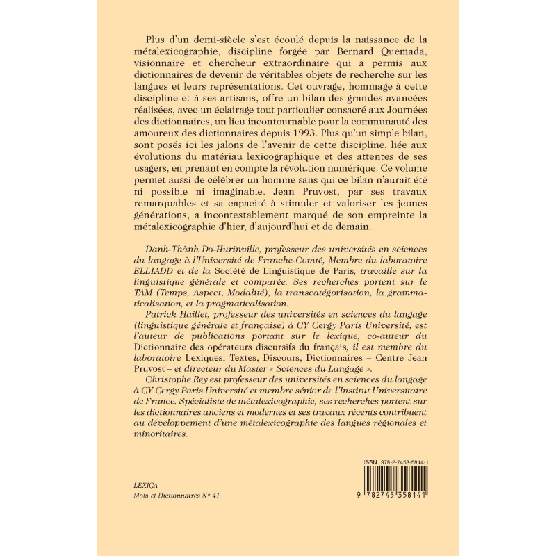 Plus d’un demi-siècle s’est écoulé depuis la naissance de la métalexicographie, discipline forgée par Bernard Quemada, visionnaire et chercheur extraordinaire qui a permis aux dictionnaires de devenir de véritables objets de recherche sur les langues et leurs représentations. Cet ouvrage, hommage à cette discipline et à ses artisans, offre un bilan des grandes avancées réalisées, avec un éclairage tout particulier consacré aux Journées des dictionnaires, un lieu incontournable pour la communauté des amoureux des dictionnaires depuis 1993. Plus qu’un simple bilan, sont posés ici les jalons de l’avenir de cette discipline, liée aux évolutions du matériau lexicographique et des attentes de ses usagers, en prenant en compte la révolution numérique. Ce volume permet aussi de célébrer un homme sans qui ce bilan n’aurait été ni possible ni imaginable. Jean Pruvost, par ses travaux remarquables et sa capacité à stimuler et valoriser les jeunes générations, a incontestablement marqué de son empreinte la métalexicographie d’hier, d’aujourd’hui et de demain.