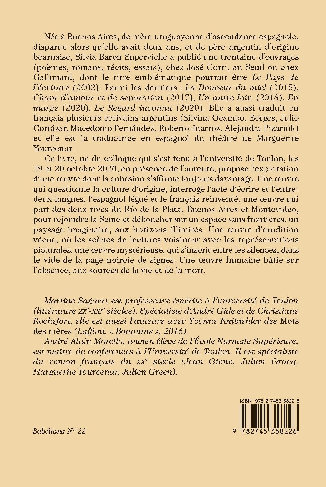 Née à Buenos Aires, de mère uruguayenne d’ascendance espagnole, disparue alors qu’elle avait deux ans, et de père argentin d’origine béarnaise, Silvia Baron Supervielle a publié une trentaine d’ouvrages (poèmes, romans, récits, essais), chez José Corti, au Seuil ou chez Gallimard, dont le titre emblématique pourrait être Le Pays de l’écriture (2002). Parmi les derniers : La Douceur du miel (2015), Chant d’amour et de séparation (2017), Un autre loin (2018), En marge (2020), Le Regard inconnu (2020). Elle a aussi traduit en français plusieurs écrivains argentins (Silvina Ocampo, Borges, Julio Cortázar, Macedonio Fernández, Roberto Juarroz, Alejandra Pizarnik) et elle est la traductrice en espagnol du théâtre de Marguerite Yourcenar.