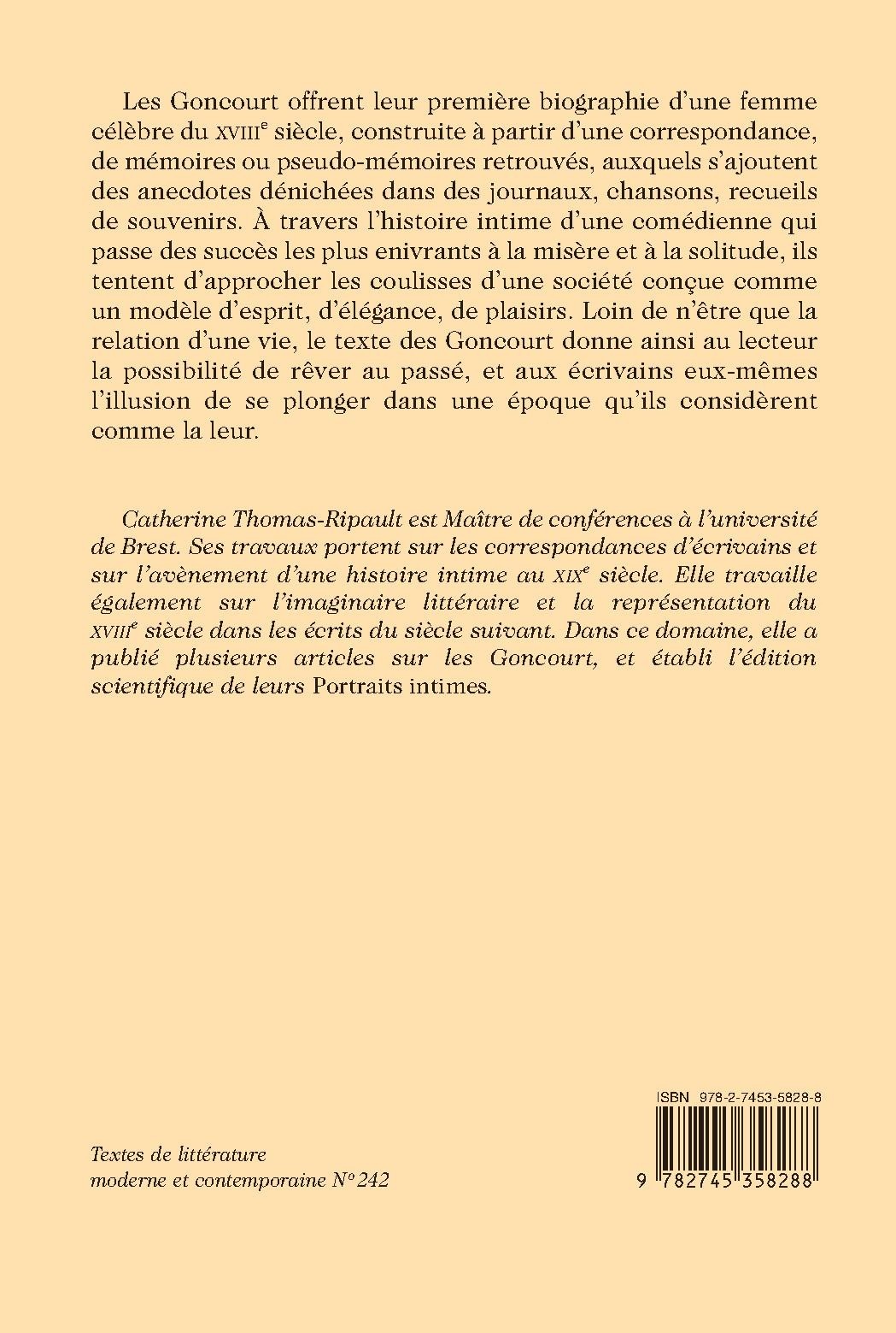 Les Goncourt offrent leur première biographie d’une femme célèbre du XVIIIe siècle, construite à partir d’une correspondance, de mémoires ou pseudo-mémoires retrouvés, auxquels s’ajoutent des anecdotes dénichées dans des journaux, chansons, recueils de souvenirs. À travers l’histoire intime d’une comédienne qui passe des succès les plus enivrants à la misère et à la solitude, ils tentent d’approcher les coulisses d’une société conçue comme un modèle d’esprit, d’élégance, de plaisirs. Loin de n’être que la relation d’une vie, le texte des Goncourt donne ainsi au lecteur la possibilité de rêver au passé, et aux écrivains eux-mêmes l’illusion de se plonger dans une époque qu’ils considèrent comme la leur.