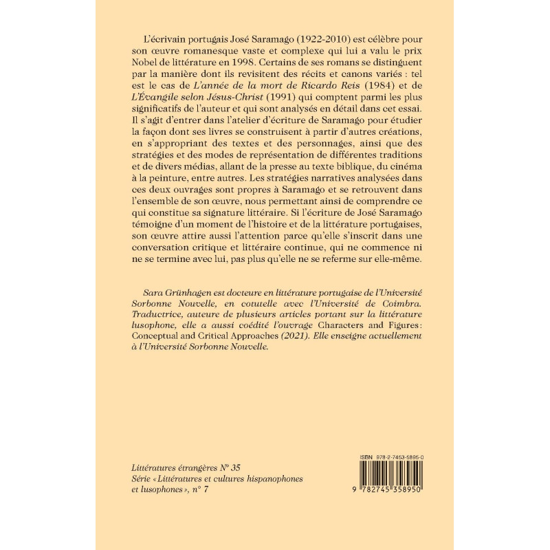 L’écrivain portugais José Saramago (1922-2010) est célèbre pour son œuvre romanesque vaste et complexe qui lui a valu le prix Nobel de littérature en 1998. Certains de ses romans se distinguent par la manière dont ils revisitent des récits et canons variés : tel est le cas de L’année de la mort de Ricardo Reis (1984) et de L’Évangile selon Jésus-Christ (1991) qui comptent parmi les plus significatifs de l’auteur et qui sont analysés en détail dans cet essai. Il s’agit d’entrer dans l’atelier d’écriture de Saramago pour étudier la façon dont ses livres se construisent à partir d’autres créations, en s’appropriant des textes et des personnages, ainsi que des stratégies et des modes de représentation de différentes traditions et de divers médias, allant de la presse au texte biblique, du cinéma à la peinture, entre autres. Les stratégies narratives analysées dans ces deux ouvrages sont propres à Saramago et se retrouvent dans l’ensemble de son œuvre, nous permettant ainsi de comprendre ce qui constitue sa signature littéraire. Si l’écriture de José Saramago témoigne d’un moment de l’histoire et de la littérature portugaises, son œuvre attire aussi l’attention parce qu’elle s’inscrit dans une conversation critique et littéraire continue, qui ne commence ni ne se termine avec lui, pas plus qu’elle ne se referme sur elle-même.