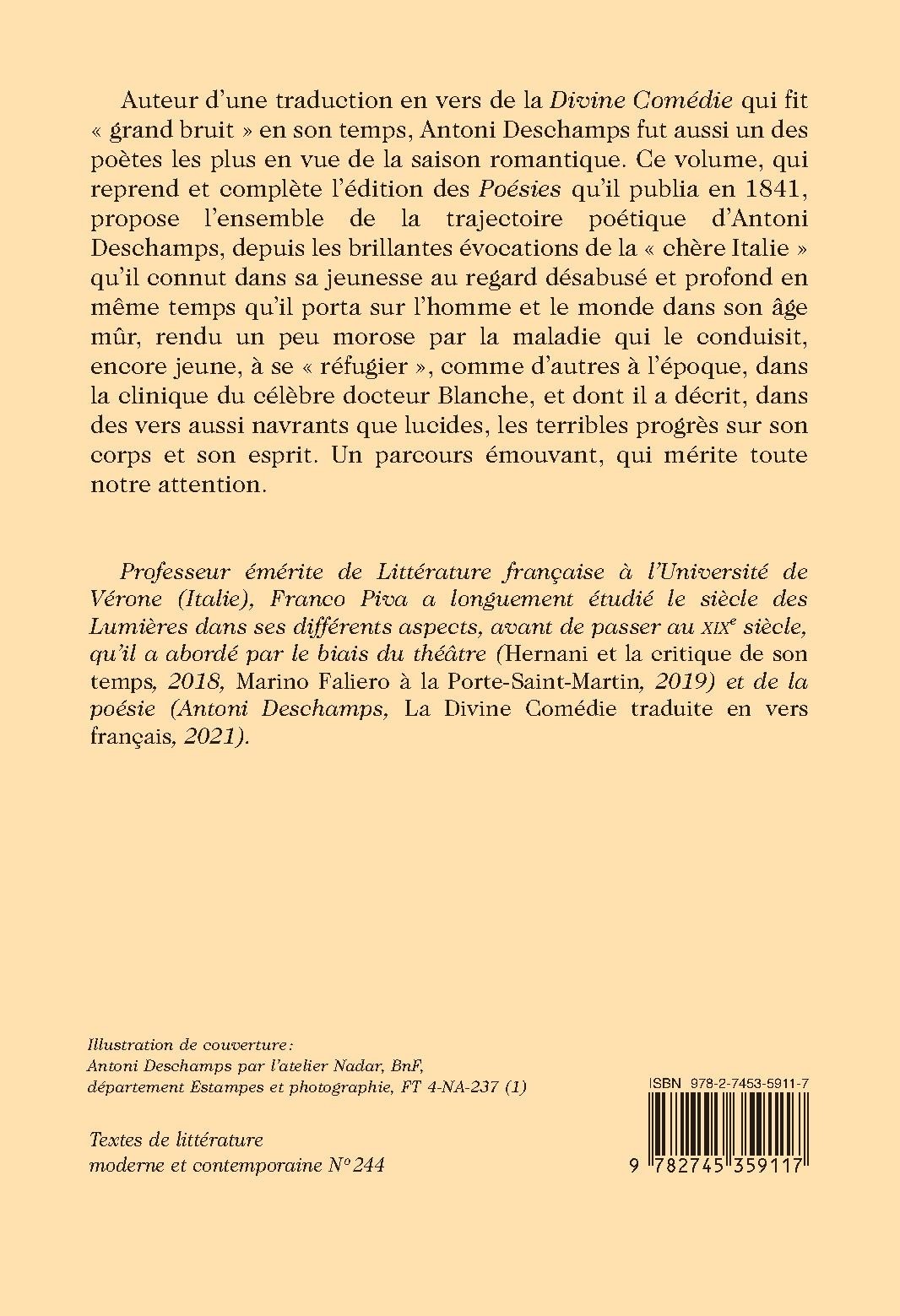 Auteur d’une traduction en vers de la Divine Comédie qui fit « grand bruit » en son temps, Antoni Deschamps fut aussi un des poètes les plus en vue de la saison romantique. Ce volume, qui reprend et complète l’édition des Poésies qu’il publia en 1841, propose l’ensemble de la trajectoire poétique d’Antoni Deschamps, depuis les brillantes évocations de la « chère Italie » qu’il connut dans sa jeunesse au regard désabusé et profond en même temps qu’il porta sur l’homme et le monde dans son âge mûr, rendu un peu morose par la maladie qui le conduisit, encore jeune, à se « réfugier », comme d’autres à l’époque, dans la clinique du célèbre docteur Blanche, et dont il a décrit, dans des vers aussi navrants que lucides, les terribles progrès sur son corps et son esprit. Un parcours émouvant, qui mérite toute notre attention.