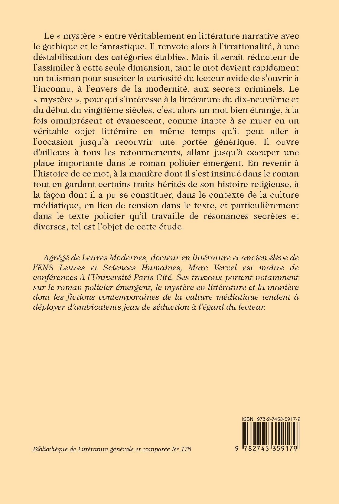 Le « mystère » entre véritablement en littérature narrative avec le gothique et le fantastique. Il renvoie alors à l’irrationalité, à une déstabilisation des catégories établies. Mais il serait réducteur de l’assimiler à cette seule dimension, tant le mot devient rapidement un talisman pour susciter la curiosité du lecteur avide de s’ouvrir à l’inconnu, à l’envers de la modernité, aux secrets criminels. Le « mystère », pour qui s’intéresse à la littérature du dix-neuvième et du début du vingtième siècles, c’est alors un mot bien étrange, à la fois omniprésent et évanescent, comme inapte à se muer en un véritable objet littéraire en même temps qu’il peut aller à l’occasion jusqu’à recouvrir une portée générique. Il ouvre d’ailleurs à tous les retournements, allant jusqu’à occuper une place importante dans le roman policier émergent. En revenir à l’histoire de ce mot, à la manière dont il s’est insinué dans le roman tout en gardant certains traits hérités de son histoire religieuse, à la façon dont il a pu se constituer, dans le contexte de la culture médiatique, en lieu de tension dans le texte, et particulièrement dans le texte policier qu’il travaille de résonances secrètes et diverses, tel est l’objet de cette étude.
