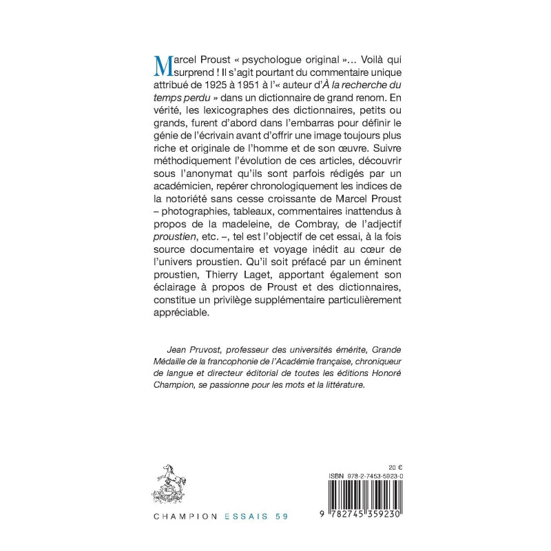 Marcel Proust « psychologue original » … Voilà qui surprend ! Il s’agit pourtant du commentaire unique attribué de 1925 à 1951 à l’ « auteur d’À la recherche du temps perdu » dans un dictionnaire de grand renom. En vérité, les lexicographes des dictionnaires, petits ou grands, furent d’abord dans l’embarras pour définir le génie de l’écrivain avant d’offrir une image toujours plus riche et originale de l’homme et de son œuvre. Suivre méthodiquement l’évolution de ces articles, découvrir sous l’anonymat qu’ils sont parfois rédigés par un académicien, repérer chronologiquement les indices de la notoriété sans cesse croissante de Marcel Proust – photographies, tableaux, commentaires inattendus à propos de la madeleine, de Combray, de l’adjectif proustien, etc. –, tel est l’objectif de cet essai, à la fois source documentaire et voyage inédit au cœur de l’univers proustien. Qu’il soit préfacé par un éminent proustien, Thierry Laget, apportant également son éclairage à propos de Proust et des dictionnaires, constitue un privilège supplémentaire particulièrement appréciable.