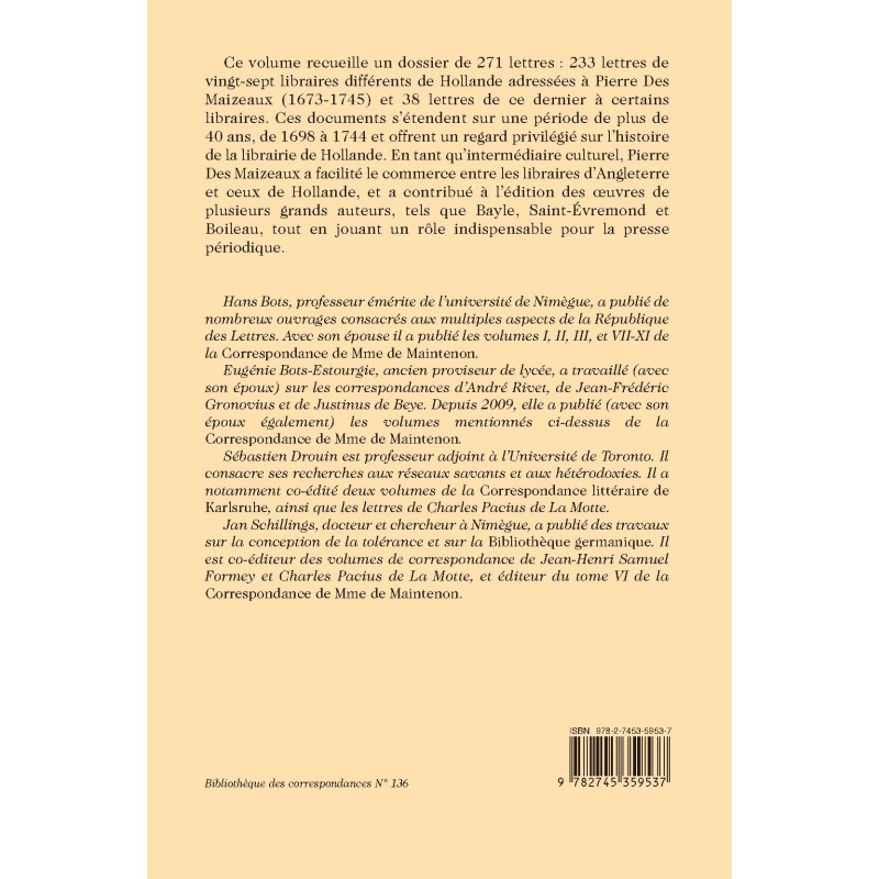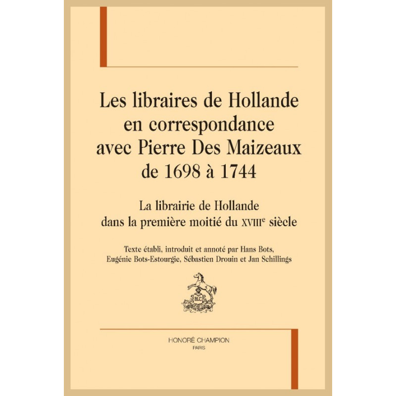Ce volume recueille un dossier de 271 lettres : 233 lettres de vingt-sept libraires différents de Hollande adressées à Pierre Des Maizeaux (1673-1745) et 38 lettres de ce dernier à certains libraires. Ces documents s’étendent sur une période de plus de 40 ans, de 1698 à 1744 et offrent un regard privilégié sur l’histoire de la librairie de Hollande. En tant qu’intermédiaire culturel, Pierre Des Maizeaux a facilité le commerce entre les libraires d’Angleterre et ceux de Hollande, et a contribué à l’édition des œuvres de plusieurs grands auteurs, tels que Bayle, Saint-Évremond et Boileau, tout en jouant un rôle indispensable pour la presse périodique.