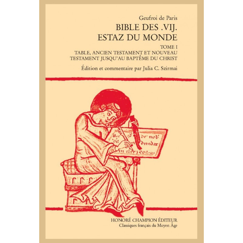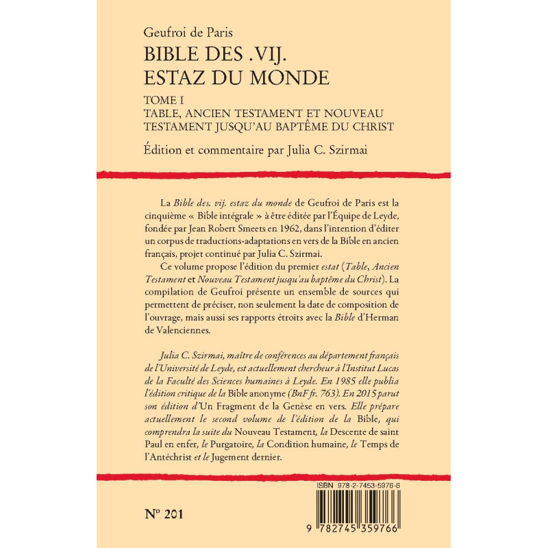 La Bible des. vij. estaz du monde de Geufroi de Paris est la cinquième « Bible intégrale » à être éditée par l’Équipe de Leyde, fondée par Jean Robert Smeets en 1962, dans l’intention d’éditer un corpus de traductions-adaptations en vers de la Bible en ancien français, projet continué par Julia C. Szirmai.