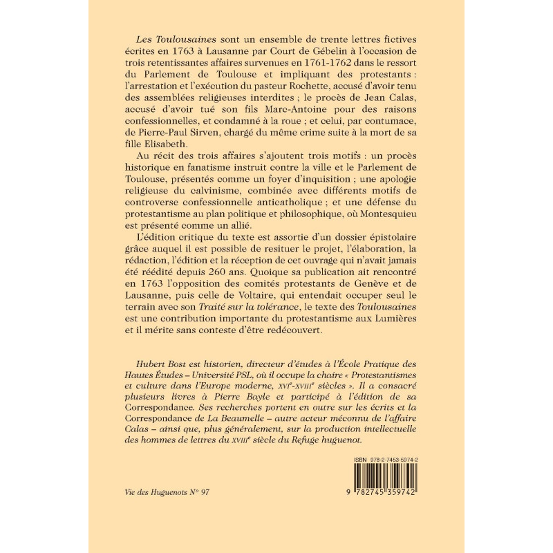 L’édition critique du texte est assortie d’un dossier épistolaire grâce auquel il est possible de resituer le projet, l’élaboration, la rédaction, l’édition et la réception de cet ouvrage qui n’avait jamais été réédité depuis 260 ans. Quoique sa publication ait rencontré en 1763 l’opposition des comités protestants de Genève et de Lausanne, puis celle de Voltaire, qui entendait occuper seul le terrain avec son Traité sur la tolérance, le texte des Toulousaines est une contribution importante du protestantisme aux Lumières et il mérite sans conteste d’être redécouvert.