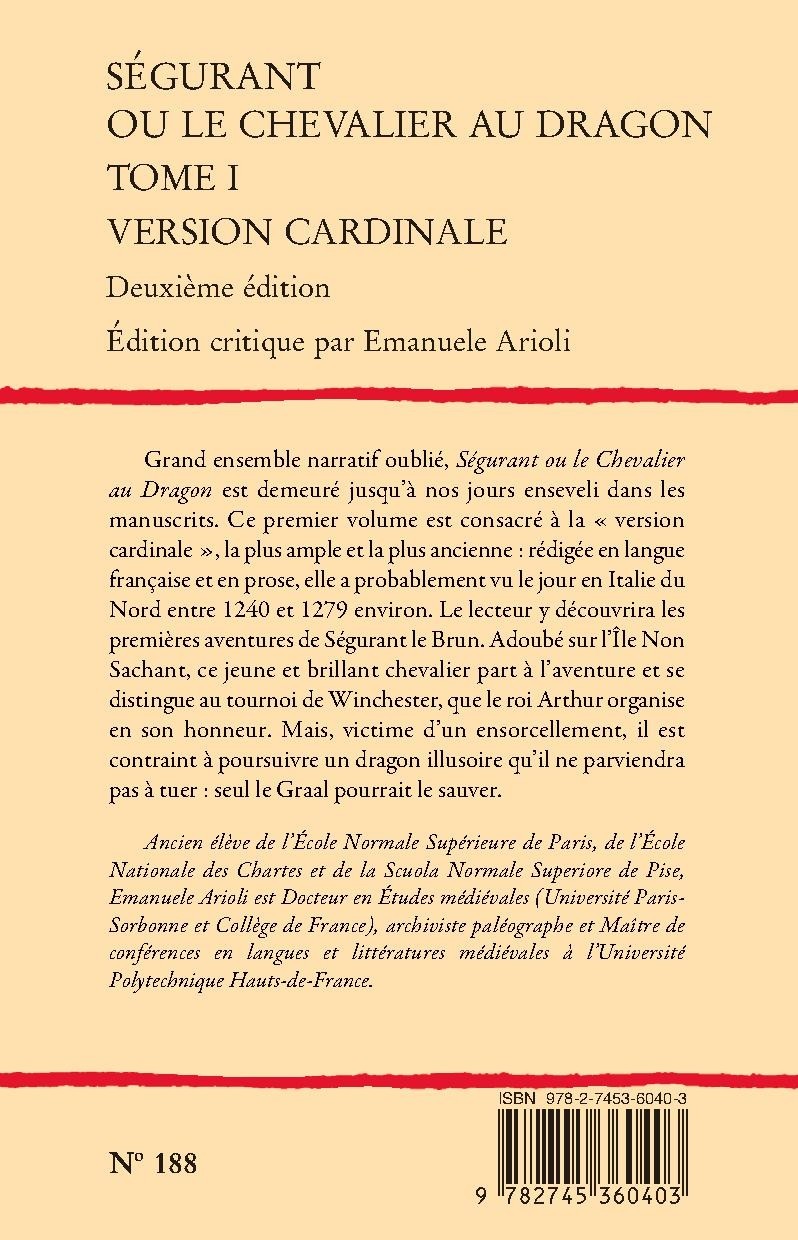 Grand ensemble narratif oublié, Ségurant ou le Chevalier au Dragon est demeuré jusqu’à nos jours enseveli dans les manuscrits. Ce premier volume est consacré à la « version cardinale », la plus ample et la plus ancienne : rédigée en langue française et en prose, elle a probablement vu le jour en Italie du Nord entre 1240 et 1279 environ. Le lecteur y découvrira les premières aventures de Ségurant le Brun. Adoubé sur l’Île Non Sachant, ce jeune et brillant chevalier part à l’aventure et se distingue au tournoi de Winchester, que le roi Arthur organise en son honneur. Mais, victime d’un ensorcellement, il est contraint à poursuivre un dragon illusoire qu’il ne parviendra pas à tuer : seul le Graal pourrait le sauver.