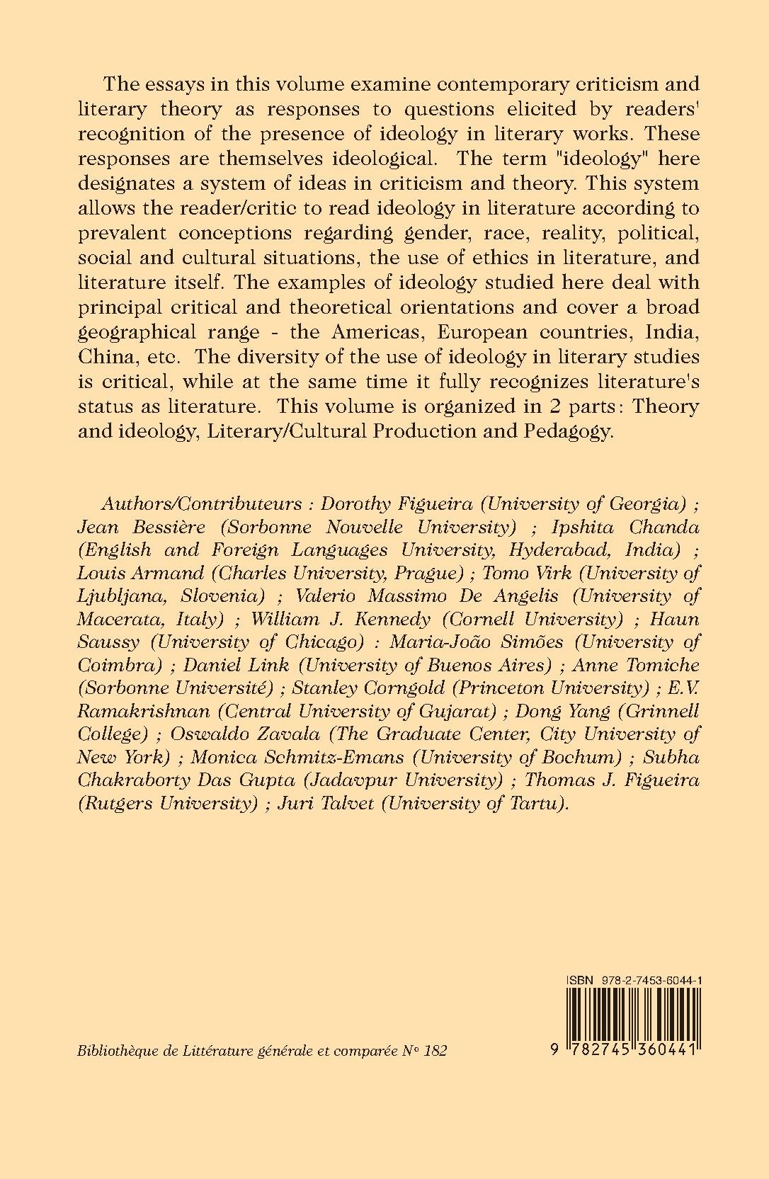 The essays in this volume examine contemporary criticism and literary theory as responses to questions elicited by readers' recognition of the presence of ideology in literary works. These responses are themselves ideological. The term "ideology" here designates a system of ideas in criticism and theory. This system allows the reader/critic to read ideology in literature according to prevalent conceptions regarding gender, race, reality, political, social and cultural situations, the use of ethics in literature, and literature itself. The examples of ideology studied here deal with principal critical and theoretical orientations and cover a broad geographical range - the Americas, European countries, India, China, etc. The diversity of the use of ideology in literary studies is critical, while at the same time it fully recognizes literature's status as literature. This volume is organized in 2 parts: Theory and ideology, Literary/Cultural Production and Pedagogy.