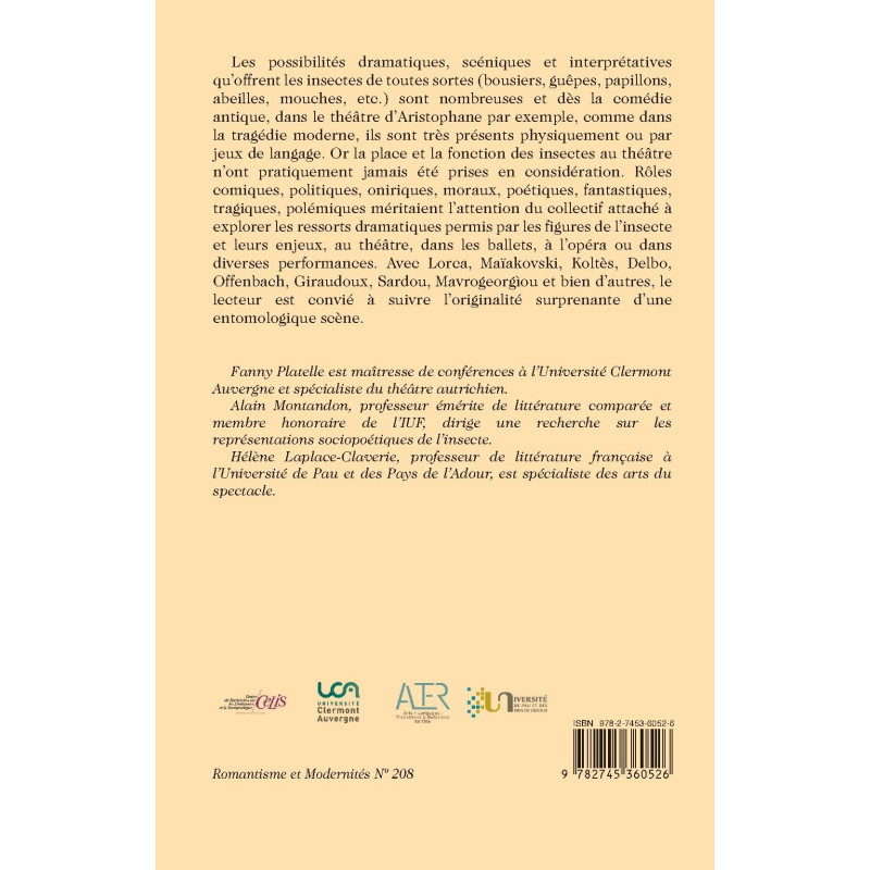 Les possibilités dramatiques, scéniques et interprétatives qu’offrent les insectes de toutes sortes (bousiers, guêpes, papillons, abeilles, mouches, etc.) sont nombreuses et dès la comédie antique, dans le théâtre d’Aristophane par exemple, comme dans la tragédie moderne, ils sont très présents physiquement ou par jeux de langage. Or la place et la fonction des insectes au théâtre n’ont pratiquement jamais été prises en considération. Rôles comiques, politiques, oniriques, moraux, poétiques, fantastiques, tragiques, polémiques méritaient l’attention du collectif attaché à explorer les ressorts dramatiques permis par les figures de l’insecte et leurs enjeux, au théâtre, dans les ballets, à l’opéra ou dans diverses performances. Avec Lorca, Maïakovski, Koltès, Delbo, Offenbach, Giraudoux, Sardou, Mavrogeorgìou et bien d’autres, le lecteur est convié à suivre l’originalité surprenante d’une entomologique scène.