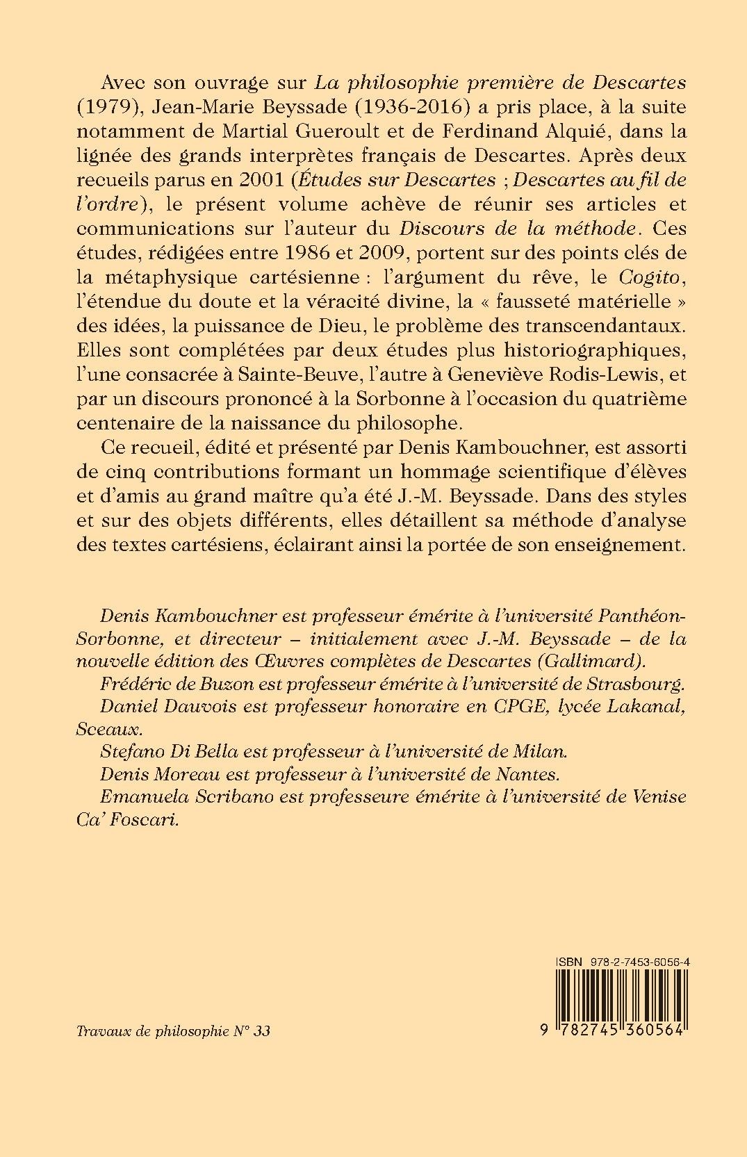 Avec son ouvrage sur La philosophie première de Descartes (1979), Jean-Marie Beyssade (1936-2016) a pris place, à la suite notamment de Martial Gueroult et de Ferdinand Alquié, dans la lignée des grands interprètes français de Descartes. Après deux recueils parus en 2001 (Études sur Descartes ; Descartes au fil de l’ordre), le présent volume achève de réunir ses articles et communications sur l’auteur du Discours de la méthode. Ces études, rédigées entre 1986 et 2009, portent sur des points clés de la métaphysique cartésienne : l’argument du rêve, le Cogito, l’étendue du doute et la véracité divine, la « fausseté matérielle » des idées, la puissance de Dieu, le problème des transcendantaux. Elles sont complétées par deux études plus historiographiques, l’une consacrée à Sainte-Beuve, l’autre à Geneviève Rodis-Lewis, et par un discours prononcé à la Sorbonne à l’occasion du quatrième centenaire de la naissance du philosophe.