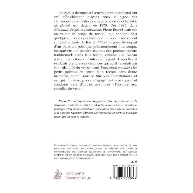 Pierre Brunel, après une longue carrière de professeur à la Sorbonne, a été élu en 2015 à l’Académie des sciences morales et politiques. Il a été président de l’Association des amis de Rimbaud et il a publié plusieurs éditions des œuvres de ce poète et plusieurs livres qui lui sont consacrés.