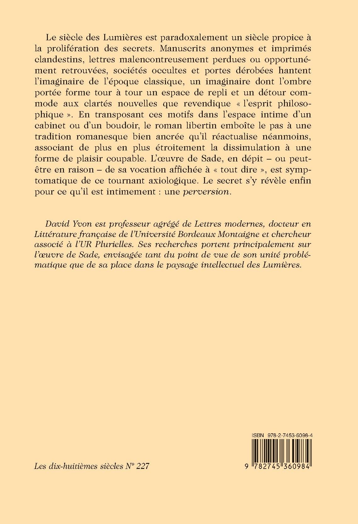 Le siècle des Lumières est paradoxalement un siècle propice à la prolifération des secrets. Manuscrits anonymes et imprimés clandestins, lettres malencontreusement perdues ou opportunément retrouvées, sociétés occultes et portes dérobées hantent l’imaginaire de l’époque classique, un imaginaire dont l’ombre portée forme tour à tour un espace de repli et un détour commode aux clartés nouvelles que revendique « l’esprit philosophique ». En transposant ces motifs dans l’espace intime d’un cabinet ou d’un boudoir, le roman libertin emboîte le pas à une tradition romanesque bien ancrée qu’il réactualise néanmoins, associant de plus en plus étroitement la dissimulation à une forme de plaisir coupable. L’œuvre de Sade, en dépit – ou peut-être en raison – de sa vocation affichée à « tout dire », est symptomatique de ce tournant axiologique. Le secret s’y révèle enfin pour ce qu’il est intimement : une perversion.